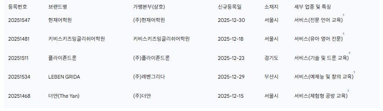이러한 신규 브랜드들의 등장은 2025년 교육 시장이 단순한 교과 보습에서 벗어나 고도의 전문성과 체험적 가치를 지향하고 있음을 보여준다. '현재어학원'과 같은 전통적인 강자가 가맹 시스템을 정비하여 신규 등록을 마친 것은 시장 지배력을 공고히 하려는 의도로 풀이되며, '플라이존드론'이나 '더얀'과 같은 브랜드의 출현은 4차 산업혁명 시대의 기술 교육과 정서적 체험 교육에 대한 예비 창업자들의 높은 관심을 반영한다.